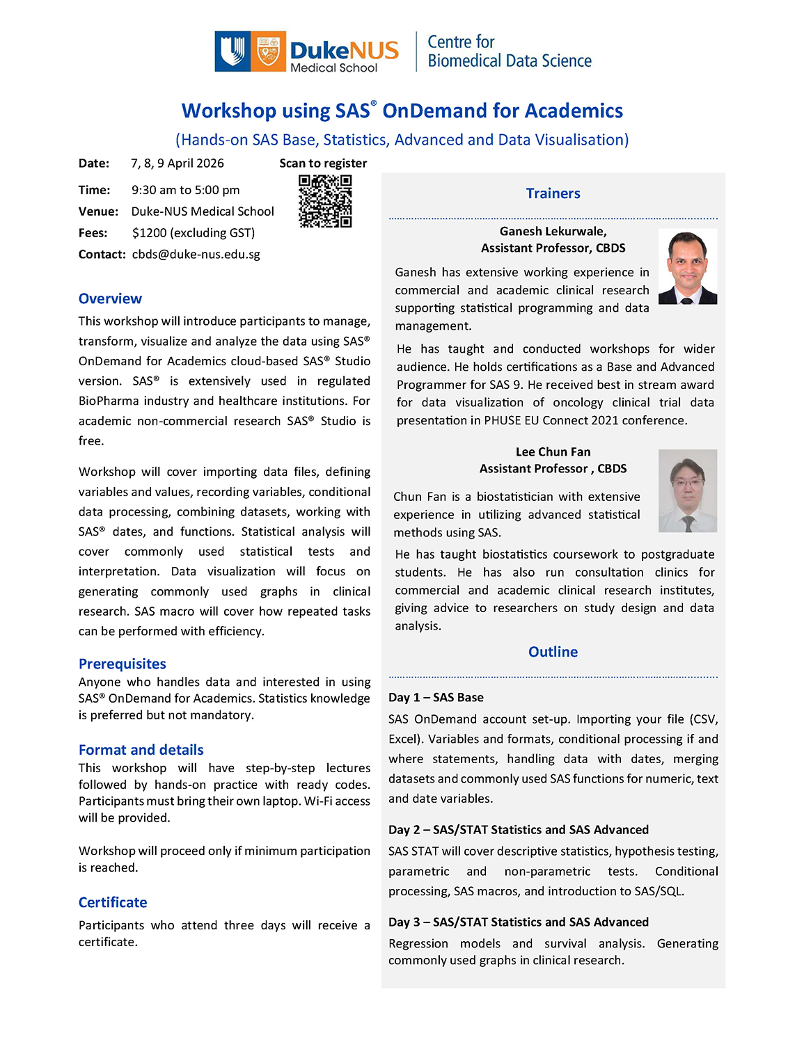 - A request for withdrawal has to be received 4 weeks before the workshop (via email to cbds@duke-nus.edu.sg).