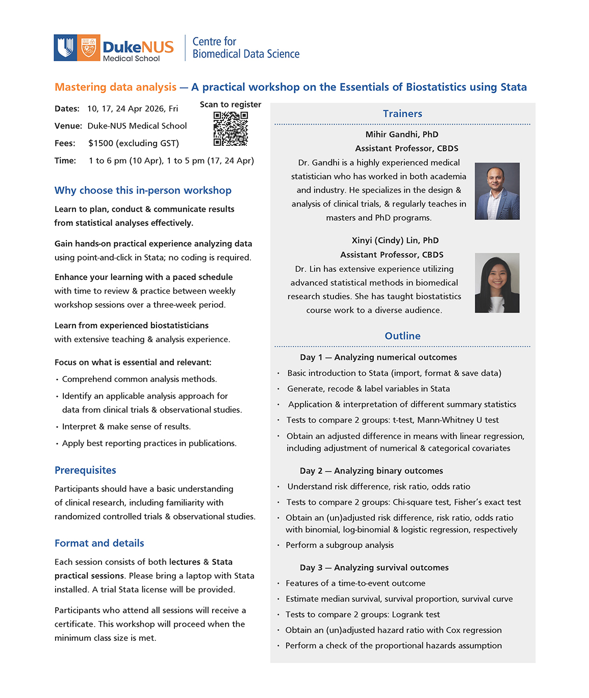 - A request for withdrawal has to be received 4 weeks before the workshop (via email to cbds@duke-nus.edu.sg).